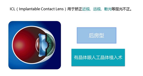 ICL(可植入式眼内接触镜)通过3mm的角膜切口植入后房,达到矫正屈光不正的效果,保留自然晶体,属于后房型有晶体眼人工晶体植入术。